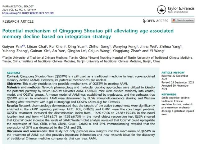 天津中医药大学王怡教授《基于整合策略探讨清宫寿桃丸改善衰老性认知减退的作用机制》的最新研究成果发表在《PHARMACEUTICAL BIOLOGY》(《药学生物学》杂志)2024年开年第一期。